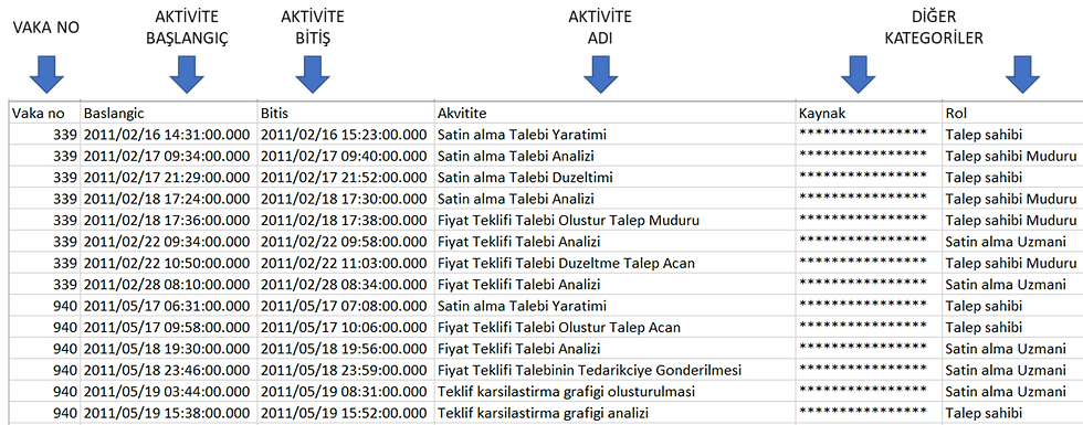 Süreç Madenciliği yapabilmek için bu dört veri olmazsa olmazdır. Bunlar dışında tutulabilecek diğer kategorik veriler ile yapabileceğiniz analizler neredeyse sınırsızdır.